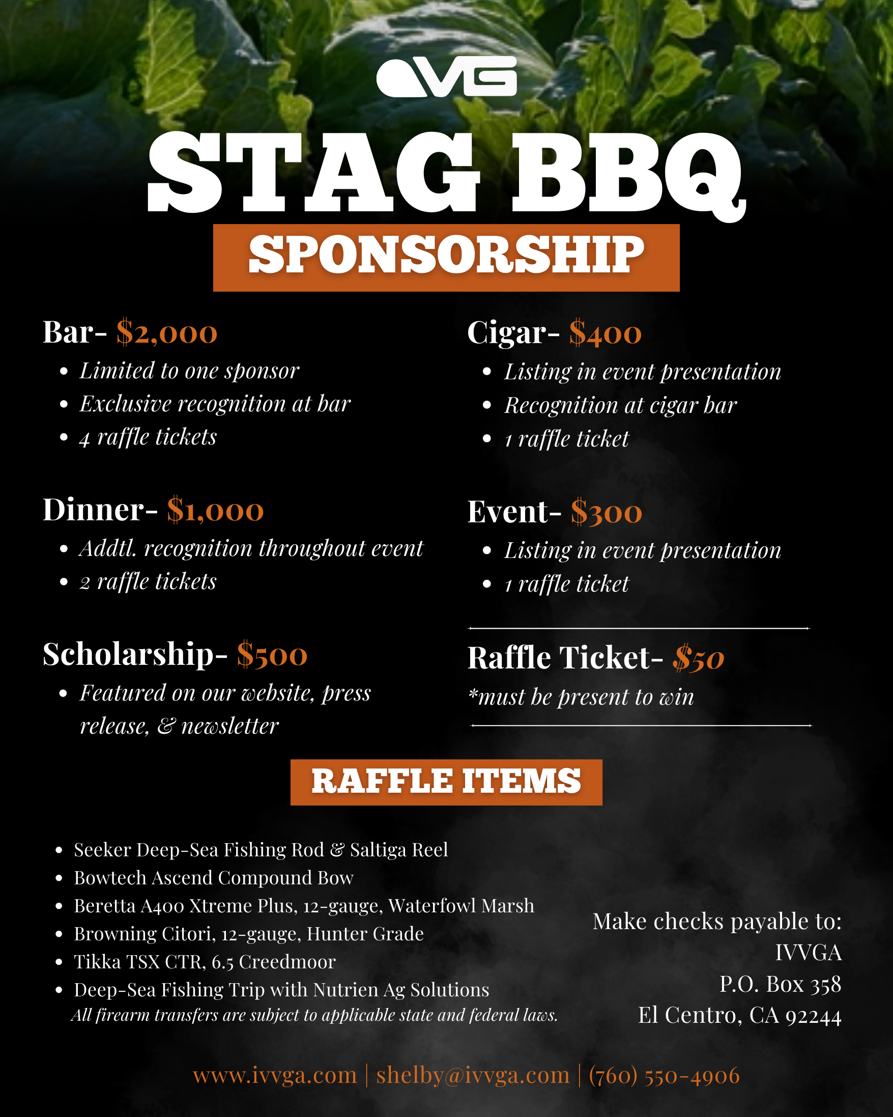 We are excited to announce that the Imperial Valley Vegetable Growers Association’s 50th Annual Stag BBQ will be held on Thursday, January 29, 2026 at Del Rio Country Club. This will be the 50th year of giving back to the produce industry and raising funds for our scholarship program.